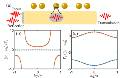 近年来,人们研究如何利用拓扑特性来设计和调控光的行为,逐步发展了拓扑光子学这一前沿领域。早期的拓扑光子学主要集中于模拟凝聚态物理中的拓扑模型和拓扑量子物态。由于光子体系具有独特的性质,可以超越对拓扑量子物态的简单模拟。例如,在光子拓扑绝缘体的基础上加上增益可以实现拓扑绝缘体激光,其具有更加优异的单色性、发光效率、稳定性。理解拓扑特性对光与原子相互作用的影响,将为开发拓扑保护的光量子器件、量子通信、量子信息处理铺平道路。波导电动力学体系[图(a)],是波导与原子耦合的混合量子体系,具有超强的光与原子相互作用,是研究量子拓扑物态与光子散射的理想平台。然而,在波导电动力学体系,由于存在光子散射,相应的能带分裂为两个不连续的分支[图(b)],从而使拓扑能带理论不再适用。发展新的理论来研究波导量子电动力学体系中的拓扑量子物态成为一个迫切的需求。