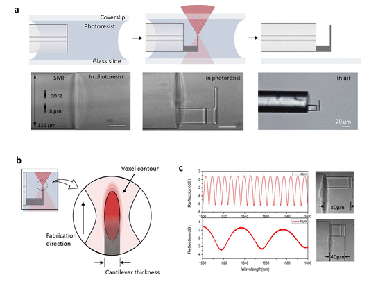 在这项工作中,我们提出的基于光纤的纳米振动传感器,其原理是光纤端面和悬臂梁组成的法布里-珀罗 (FP) 干涉仪在活体微生物悬臂梁振动时,改变了它们的光程差导致干涉动态变化。它的灵敏测试核心是通过双光子聚合 (2PP) 技术将柔性 3D 打印超灵敏悬臂梁。我们在垂直方向实施2PP打印以实现更薄的悬臂, 最终厚度为1微米左右。此外,飞秒激光的相对较低功率和聚合过程中相对较快的扫描速度使得聚合结构的与其杨氏模量相关的固有刚度较低,从而增大了悬臂梁的弹簧常数和检测灵敏度。悬臂梁的弹簧常数低至约 0.3 N/m, 与商用氮化硅 AFM 悬臂处于同一数量级。作为概念验证原型,我们证明了这种基于光纤的纳米振动传感器在大肠杆菌和白色念珠菌分别对抗生素和抗真菌药物的实时敏感性测试中显示出优异的性能,检测出它们代谢活动引起的纳米或亚纳米悬臂振动。这种兼具快速响应和并行化优势的纳米振动传感器策略可能会推动该技术成为下一代纳米振动传感器,用于大规模和快速的抗菌敏感性测试以及其他技术和生物医学应用。