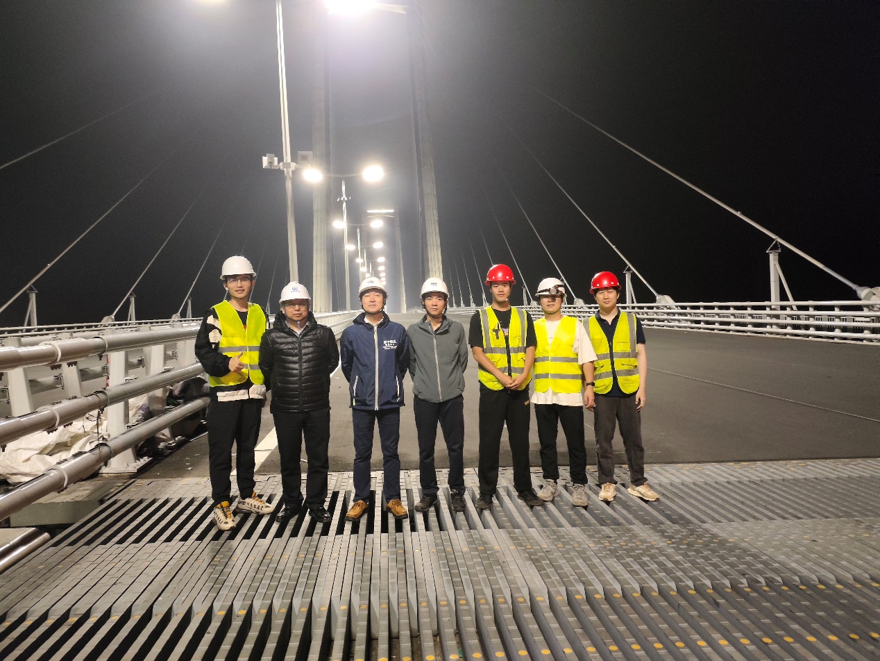 胡彪助理教授、尹义贺博士后、陈文均博士、张强博士、孙殿钧博士等11人,通过连续10余天的不懈努力,在艰苦的环境中辛勤工作,顺利完成了深中通道中山大桥和伶仃洋大桥的静动载试验测试,实现了主梁变形千米级尺度内1mm测量精度,得到了深中通道管理中心的认可。该系统将在后续结构健康监测系统中继续承担桥梁结构变形监测的重任。