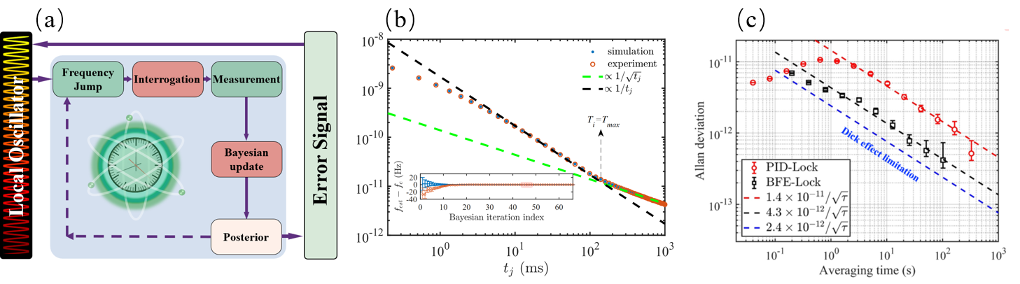 原子钟的闭环锁定是通过对比原子跃迁频率和本地振荡器的频率,产生误差信号,并伺服反馈到本地振荡器来实现的。传统的原子钟一般利用固定积分时间的拉比或拉姆塞方案,探测原子跃迁光谱半宽全高处的信号获得原子跃迁频率,经过PID(比例积分微分)伺服反馈实现闭环锁定。贝叶斯量子参数估计利用具有不同积分时间的拉姆塞干涉序列,探测原子跃迁光谱不同失谐处的信号,由贝叶斯统计给出原子跃迁频率,同时在贝叶斯迭代过程中反馈到本地振荡器,实现原子钟的闭环锁定。