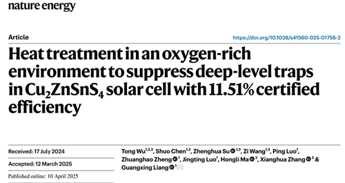 ACG港湾 梁广兴研究员及其团队在能源领域排名第1Nature Energy五年平均影响因子62.4期刊上发表题为:Heat treatment in an oxygen-rich environment to suppress deep-level traps in Cu2ZnSnS4 solar cell with 11.51% certified efficiency的最新研究论文,将铜锌锡硫化合物薄膜太阳电池的光电转换效率提升至11.51%,刷新了目前已报道的最高效率记录,标志着团队在代表性环境友好型全无机化合物薄膜太阳电池方向的研究正式迈入国际领先行列!