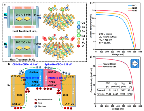异质结气氛热处理及铜锌锡硫原子排列示意图(a);能带构型示意图(b);铜锌锡硫薄膜太阳电池效率曲线-实验室测试c铜锌锡硫薄膜太阳电池效率曲线-官方认证测试d