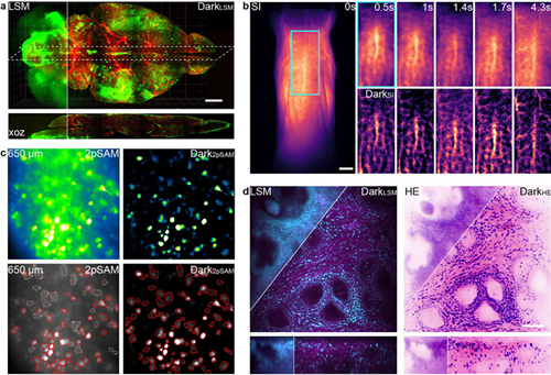 3. Dark sectioning的典型应用。(a)基于光片的小鼠全脑成像,(b)小鼠血管的小动物活体成像,(c)合成孔径双光子小鼠神经元成像,(d)前列腺组织三维光片成像与虚拟染色图像。比例尺:(a40 μm,(b2 mm,(c32 μm,(d8 μm