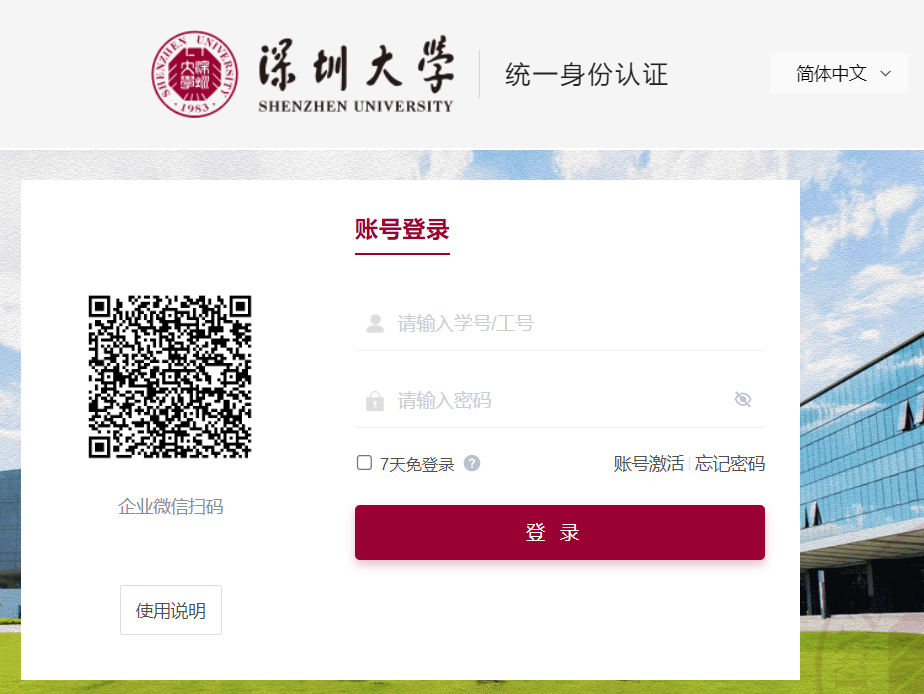 统一身份认证”界面,输入校园卡号和密码。