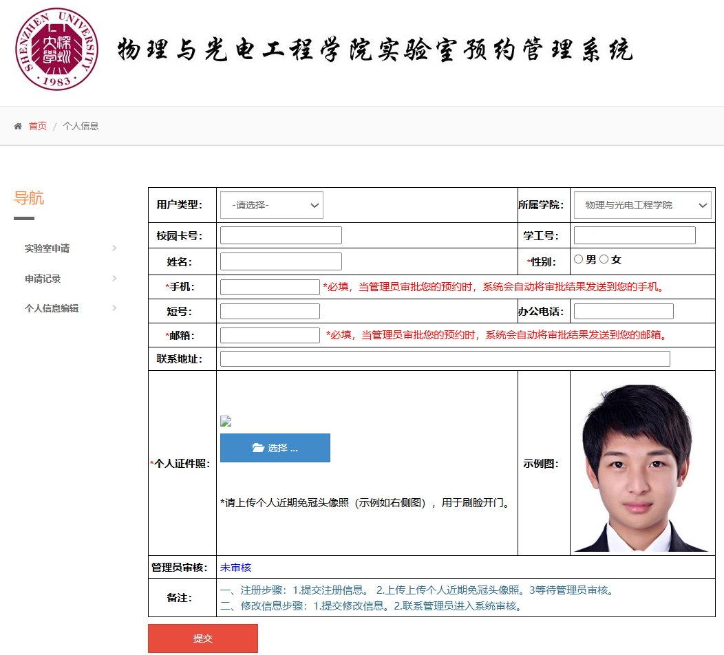 (4)提交注册后,等待后台管理员老师审核(可以主动联系实验室负责人审核)。审核通过后,人脸识别功能即生效。如果需要开通校园卡刷卡功能,需要和管理员老师联系,本人持卡录入信息。