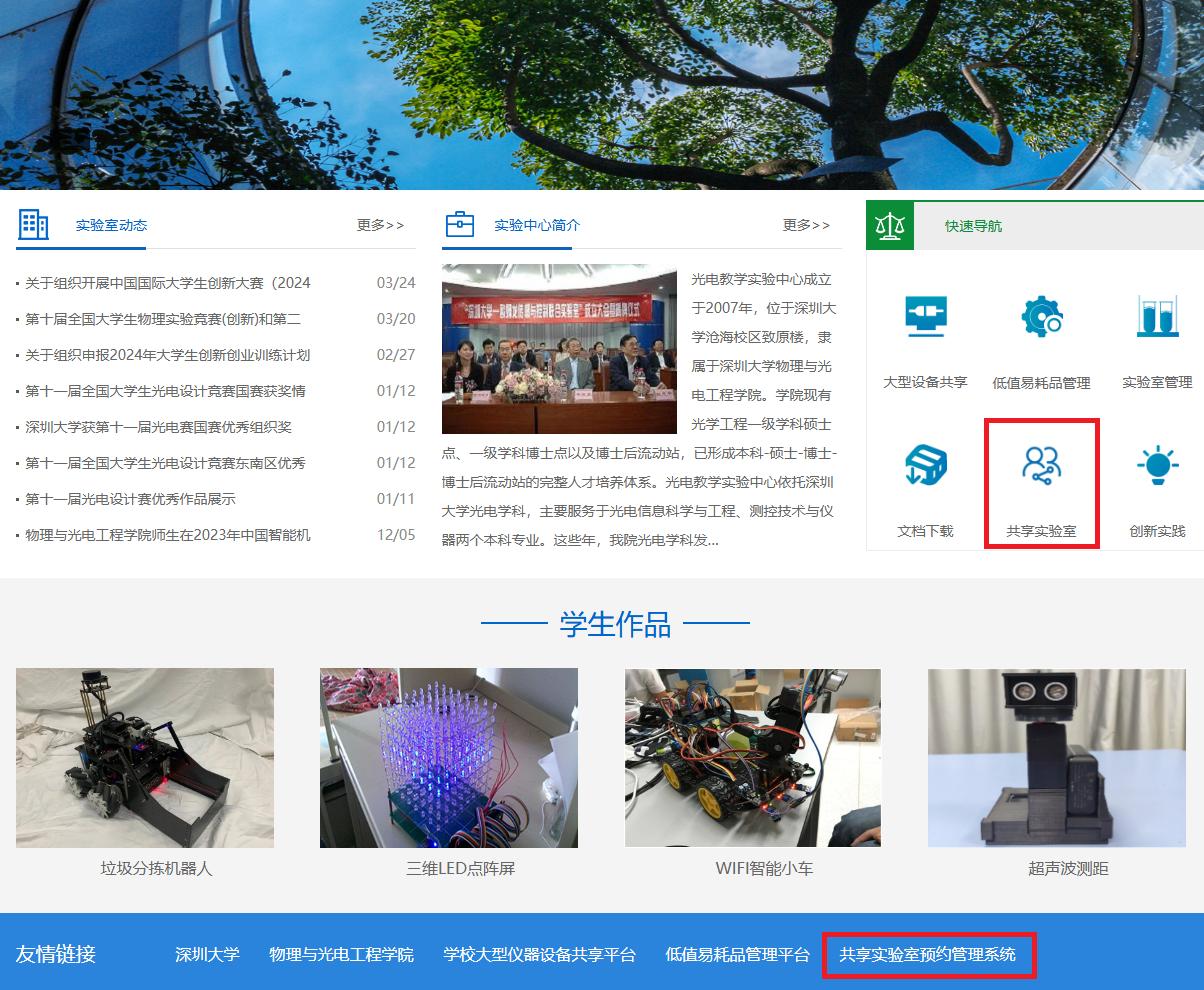 的师生们使用,方便老师同学们开展创新活动。试运行阶段,第一批开放三间共享实验室,分别是致原楼701(虚拟仪器实验室)、714(模拟数字电子技术实验室)和致腾楼316B(电子工艺实训实验室)。老师同学们可以直接通过登录网站//openlab.acggangwan.com来预约这三间实验室的使用,也可以通过“光电教学实验中心”网站//cpoelab.acggangwan.com的接口进入,如下图所示: