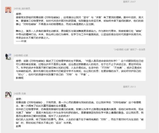 观看话剧后,大家围绕剧情与专业感悟展开热烈研讨。刘信同学道,《对称性破缺》是对科研奉献精神一曲悲壮而理性的赞歌,它让我深刻认识到,真正的奉献不在于必获成功的承诺,而在于明知前路漫长孤寂,仍愿做那个在黑暗中举灯的人。科学的火种,正是在一次次看似“破缺”的挫折与坚守中,得以传递。个人的成败渺小如尘,但投身于求真的事业,其本身即是永恒的意义。卢珊同学认为,科研的道路正如雪花会被种种意外打破的对称性,充满重重困难和阻碍。科学家即使在风雨飘摇的年代,面对理想在现实里碰壁、破碎和缺憾的境遇,从长衫到西装,从一个人到一群人,从不放弃追求真理。张效域认为,话剧中物理学家们怀报国之志,却不得不直面战乱、贫瘠的时代洪流,其个人学术追求与国家民族命运、动荡现实之间,构成了震撼人心的“对称性破缺”,促使我们思考理想的价值、选择的重量,以及在时代巨变下知识分子的责任与担当。作为新时代的研究生党员,更应从中汲取力量,学习他们为国奉献、不畏艰难的精神,坚定科研报国的信念。