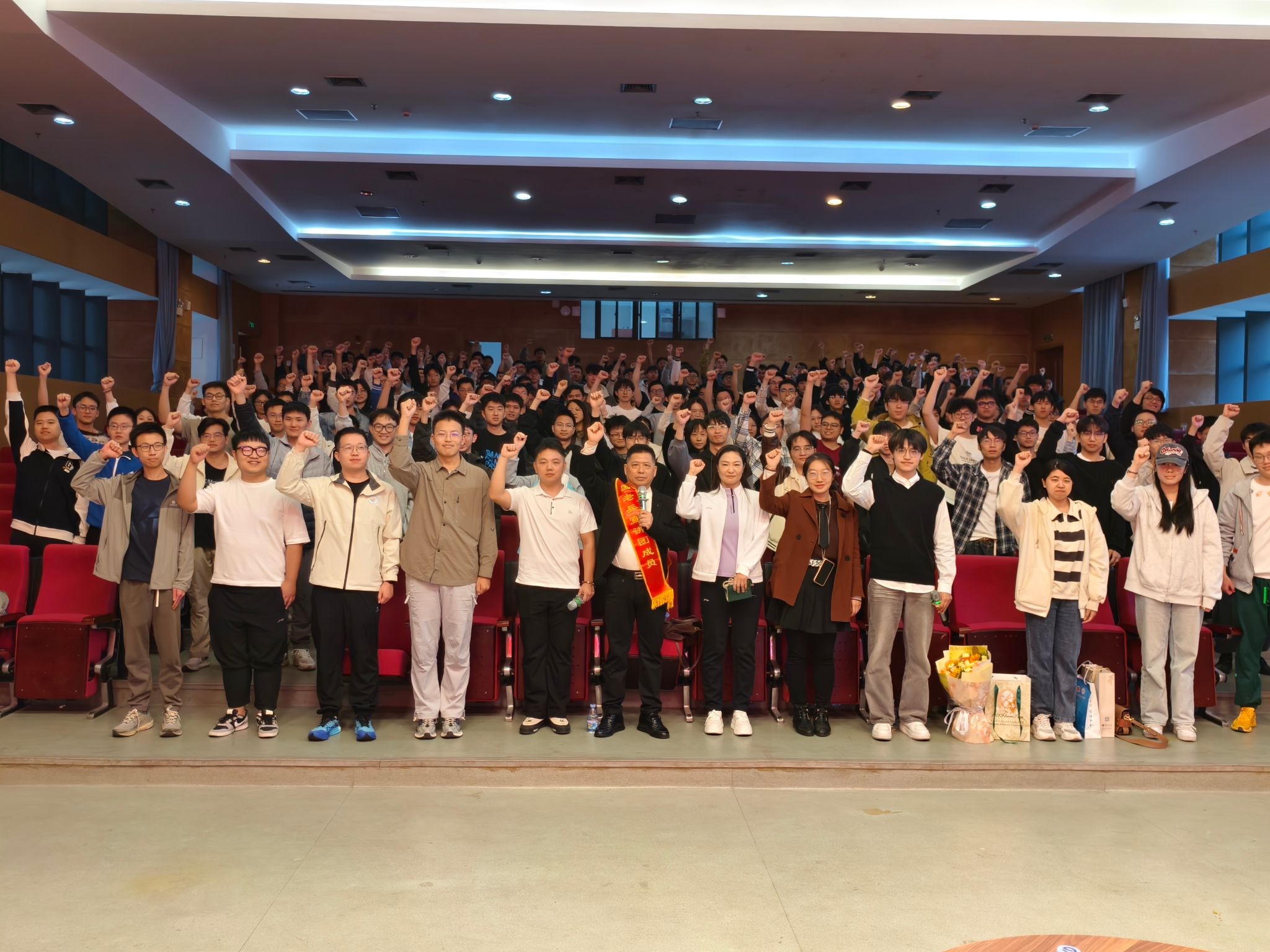 随后的“跨时空对话”访谈环节成为活动亮点。在王建贤同学的主持下,新老两代军人展开深度交流。谈及从军初心,吴冬生回溯了国家危难之际青年的使命自觉,王渼治则分享了新时代青年响应强军号召,奔赴青海高原戍边、冲锋灾害现场的抉择历程,不同时代的选择彰显着同样的家国情怀。面对“ 生死考验时的信念支撑”这一问题,二人的回答异曲同工——对祖国的忠诚与对人民的牵挂,正是克服恐惧、坚守使命的精神密码。访谈尾声,两位退役军人对青年一代殷切寄语。话音刚落 ,吴冬生便起身提议 :“咱们一起唱首《团结就是力量》,把这股精神传下去!”熟悉的旋律响起,全场在冬生大哥的带领下一起合唱,激昂的歌声震彻现场。合唱结束后,吴冬生带领大家高举拳头连喊三遍:“我是最棒的!” 口号呐喊铿锵有力 ,点燃了学子们的青春激情,将活动氛围推向高潮。